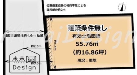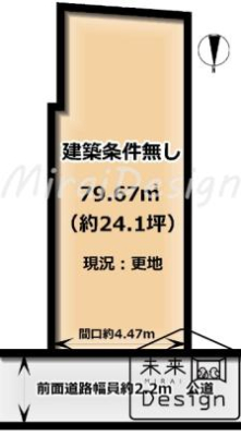 | 現況/引渡し | 更地/相談 | 接道状況 | 接道: 北西 5m 公道 道路幅: 6m |